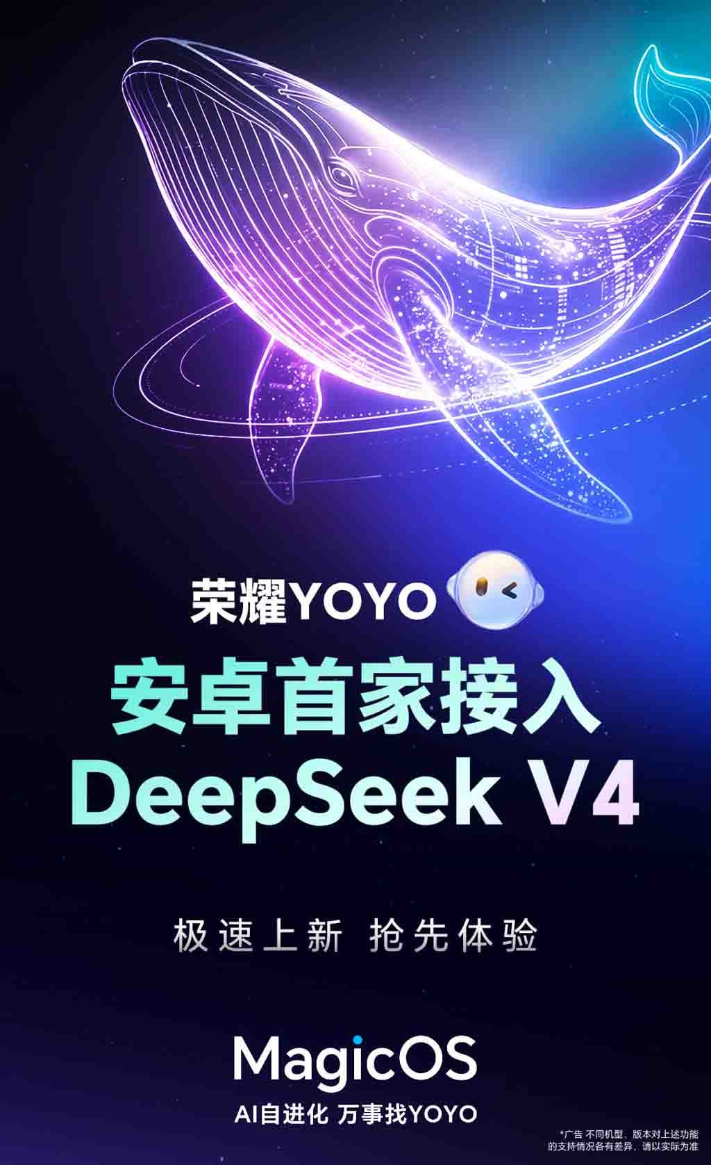 Компания называет его первым Android-агентом с поддержкой этой технологии. Подтверждение появилось в официальном тизере: Honor показала постер с упоминанием DeepSeek V4 Pro и подчеркнула: «Используйте передовые технологии искусственного интеллекта для создания сверхмощного интеллектуального агента Yoyo. DeepSeek V4 официально запущен».
