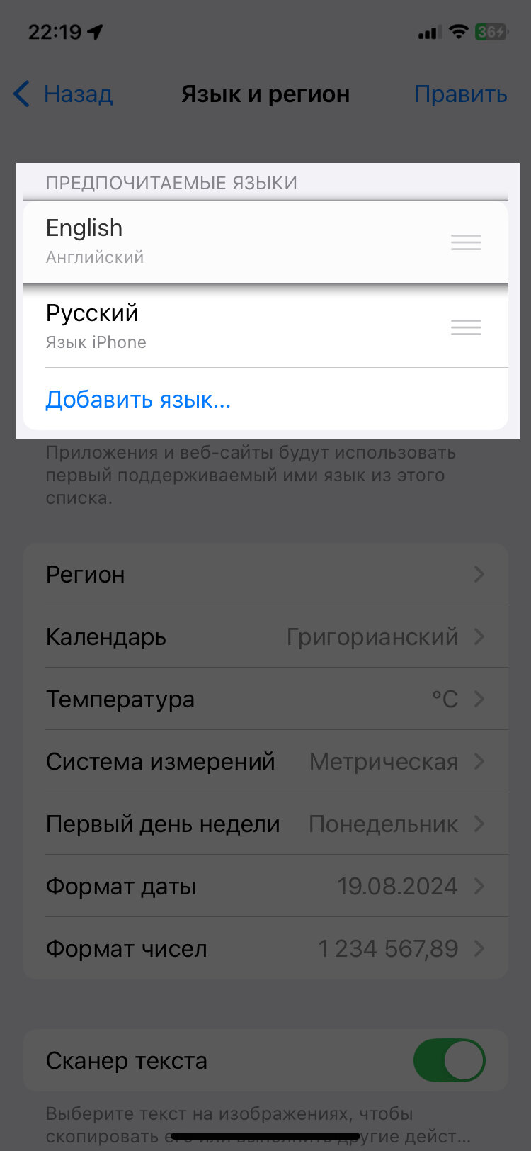 - В пункте «Предпочитаемые языки» добавьте English. Если он уже установлен (базовый вариант, без приметок наподобие «UK»), перейдите к следующему пункту.