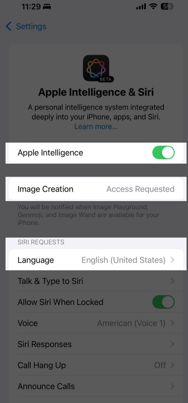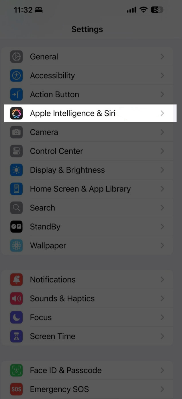 - Откройте Settings («Настройки») и перейдите в меню Apple Intelligence & Siri.