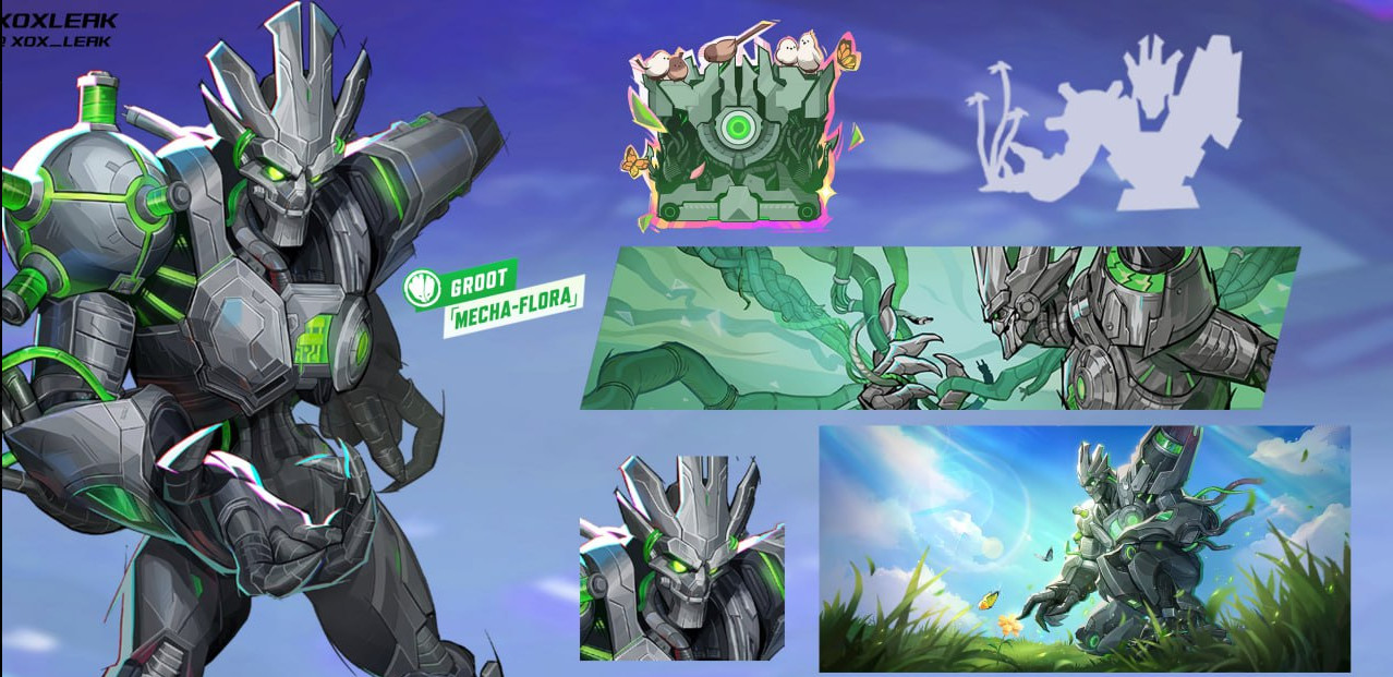 Это «Меха-Флора» для Грута и «Трон осени» для Магнето. Первый кардинально меняет вид живого дерева — персонаж получает гораздо более роботизированный вид, но сохраняет ростки и некоторые другие «натуральные» элементы. А вот Магнето с новым костюмом получит гораздо более представительный вид с фиолетовой «тройкой» и уложенной причёской.