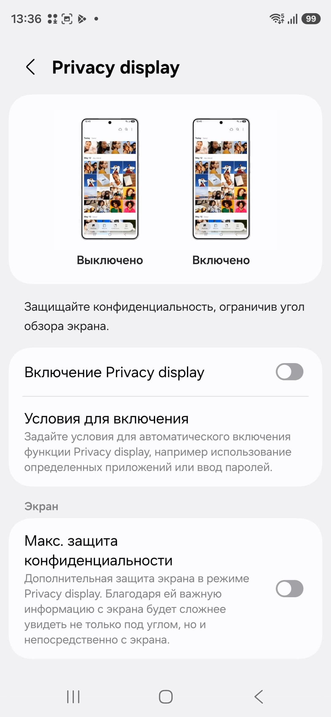 В этом смартфоне есть функция Privacy display, которая снижает вероятность того, что на экране вашего смартфона посторонние подсмотрят чувствительную информацию.