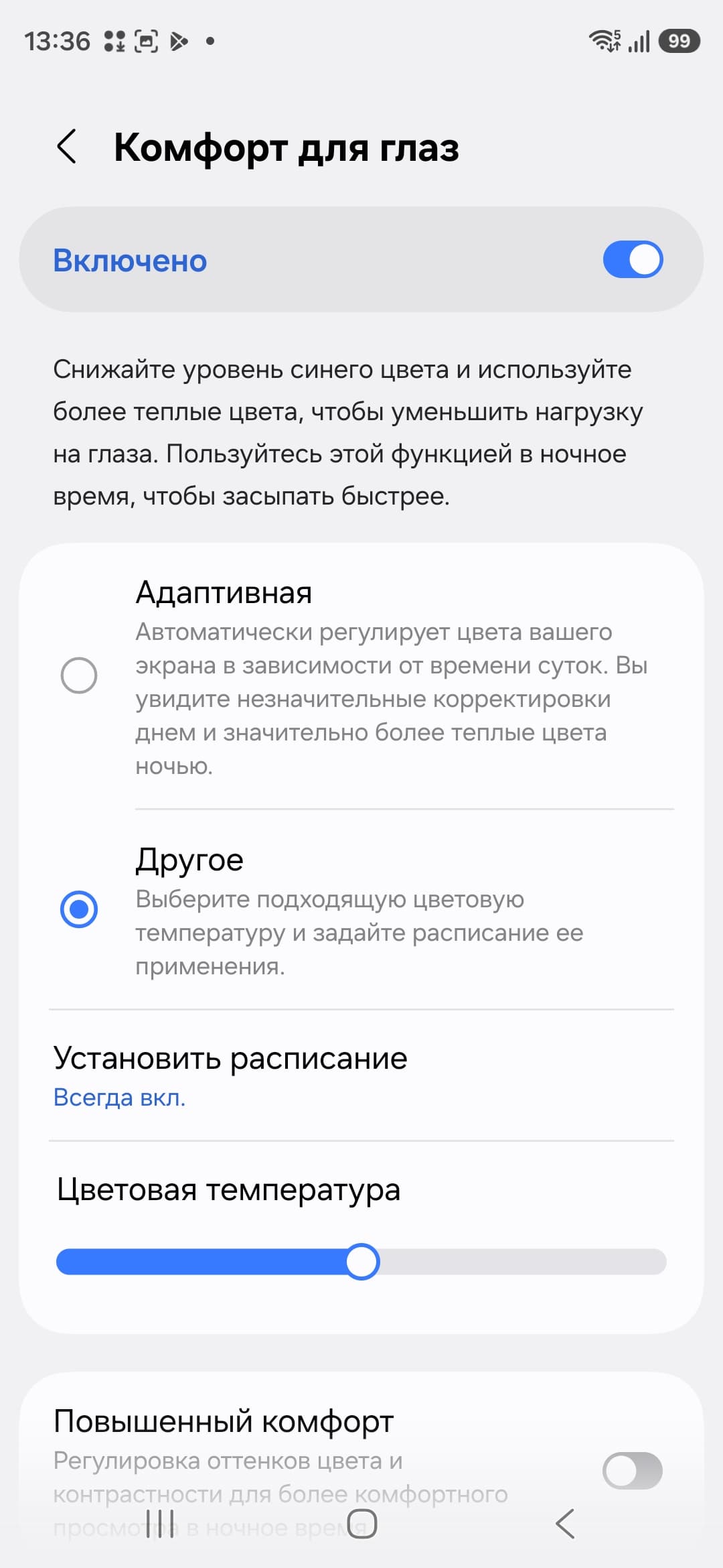 Разумеется, присутствует настройка, позволяющая снизить интенсивность синей компоненты.