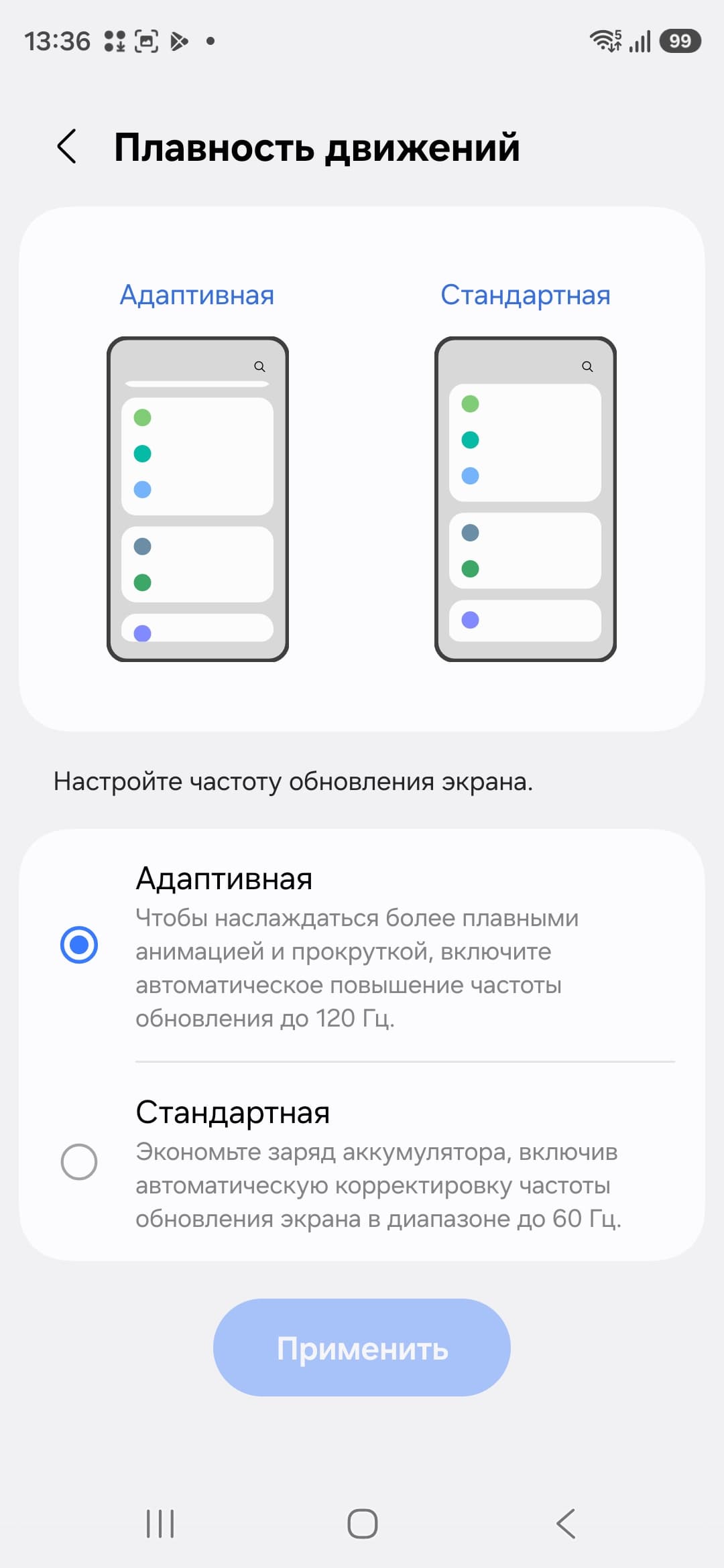 В настройках экрана можно включить режим с повышенной до 120 Гц частотой обновления. В этом режиме нам как минимум обещают увеличение плавности прокрутки.