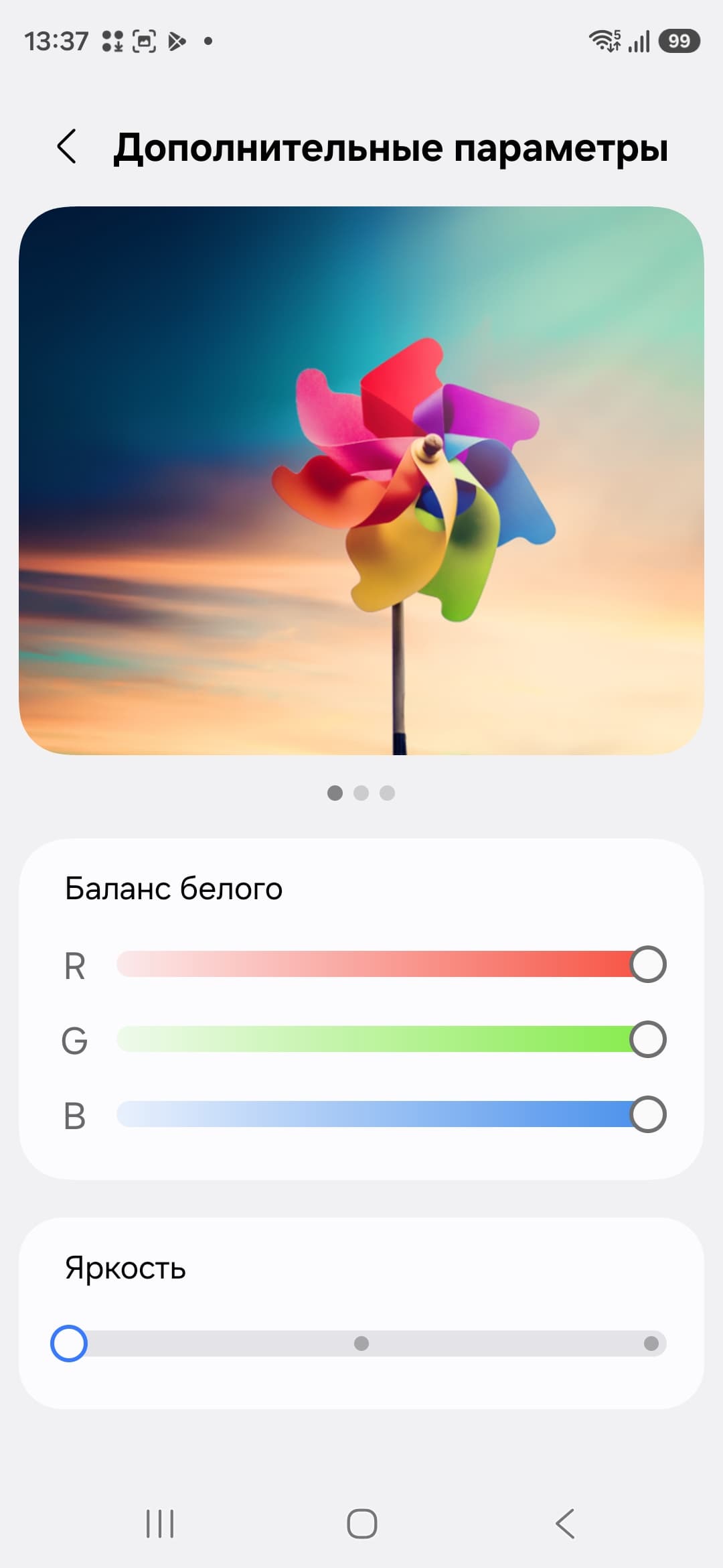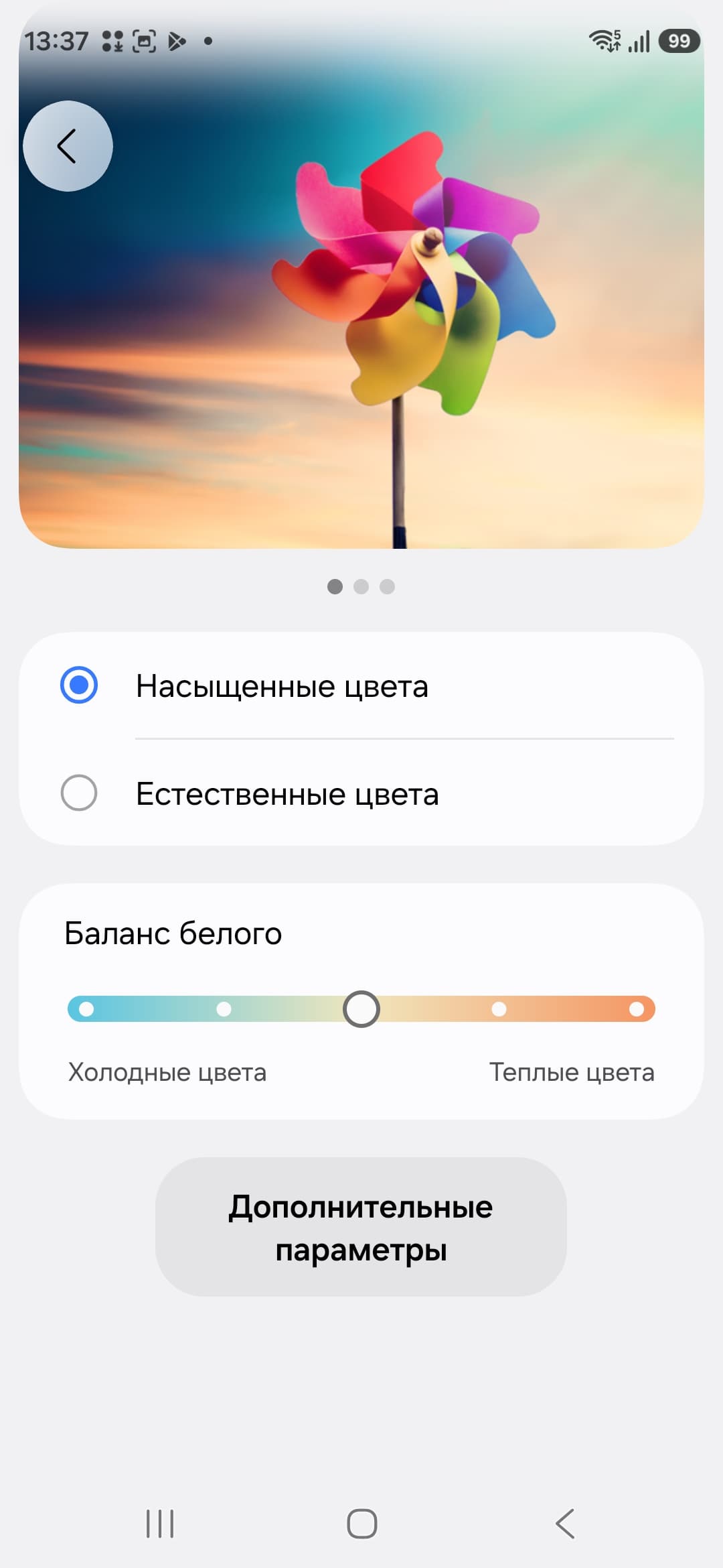 Только при выборе профиля Насыщенные цвета появляется возможность настройки цветового баланса регулировкой цветовой температуры и тремя регулировками интенсивности основных цветов, и дополнительно можно снизить или увеличить насыщенность цветов настройкой Яркость.