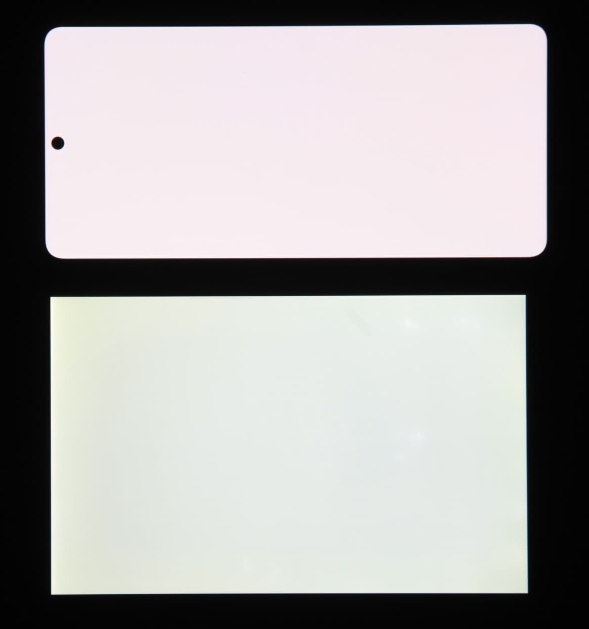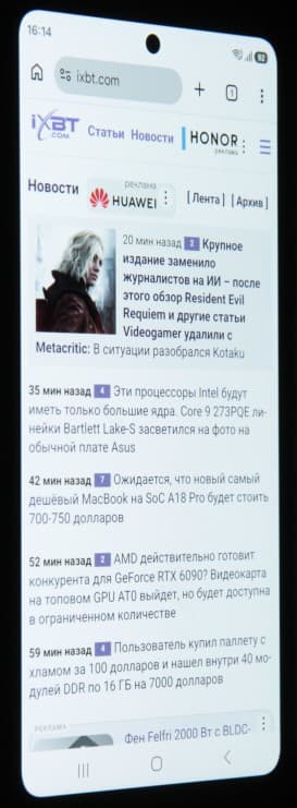 Экран характеризуется великолепными углами обзора. Яркость под углом у обоих экранов заметно уменьшается (если сравнивать с Nexus 7), но в случае смартфона падение яркости выражено гораздо меньше. В итоге при формально одинаковой яркости экран этого смартфона визуально выглядит гораздо более ярким (в сравнении с ЖК-экранами), так как на экран мобильного устройства часто приходится смотреть как минимум под небольшим углом. Правда, у смартфона белый цвет при отклонении на большие углы приобретает легкий синеватый оттенок, но черный цвет остается просто черным под любыми углами. Он настолько черный, что параметр контрастности в данном случае неприменим. Для сравнения приведем фотографии, на которых на экраны смартфона и второго участника сравнения выведены одинаковые изображения, при этом яркость экранов изначально установлена примерно на 200 кд/м², а цветовой баланс на фотоаппарате принудительно переключен на 6500 К.