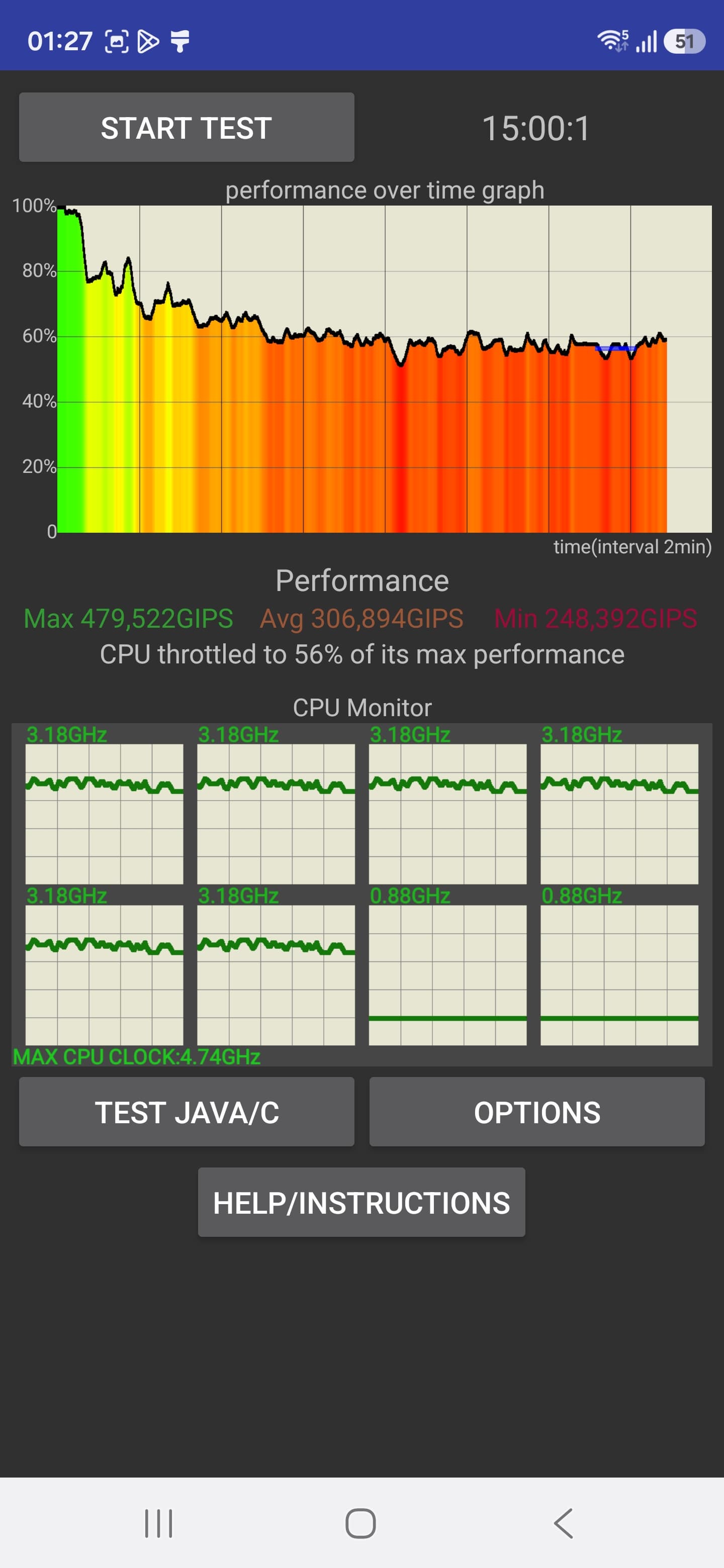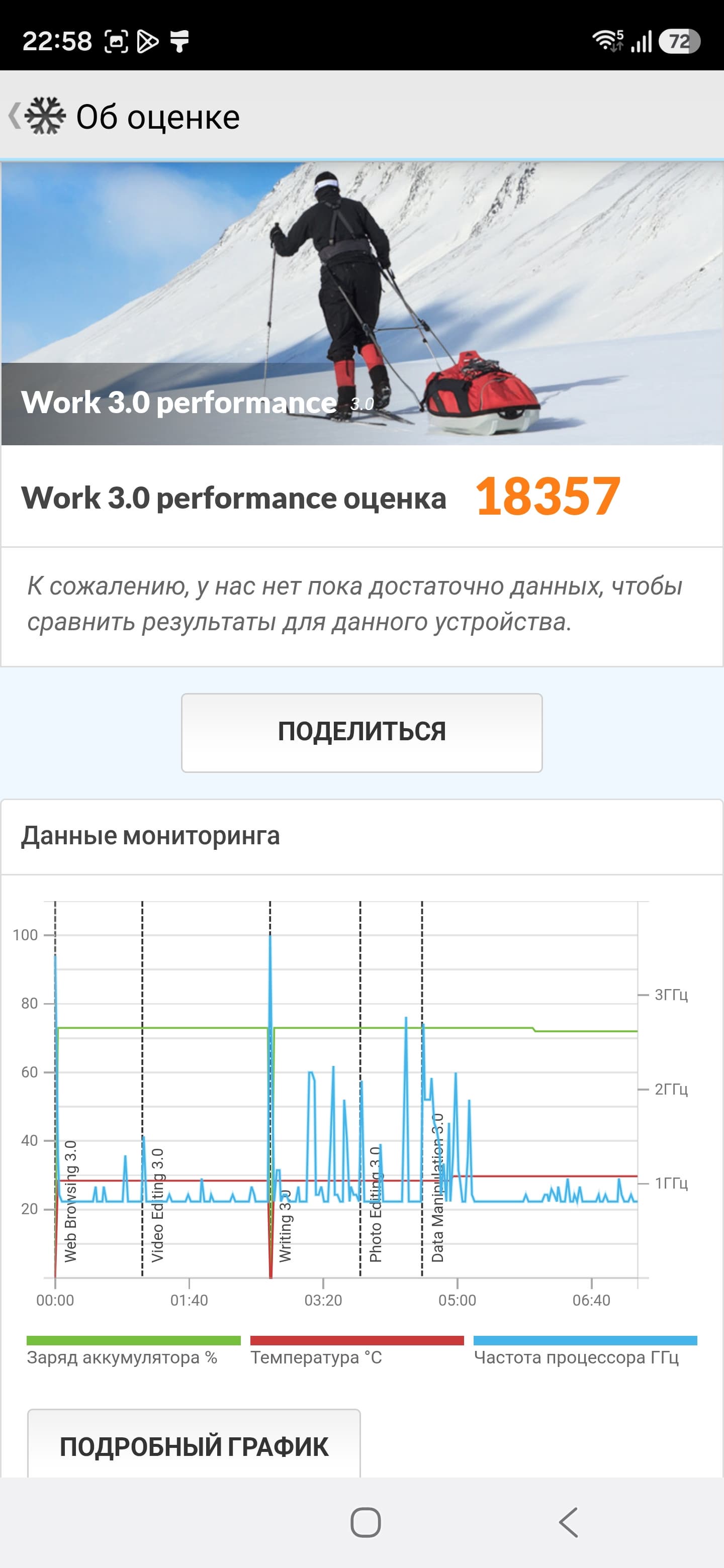Тест на снижение производительности при нагреве мы проводили с помощью программы CPU Throttling, поскольку приложение Burnout Benchmark, которым мы обычно пользуемся и которое позволяет нагружать по отдельности CPU, GPU и NPU, на данном смартфоне не запустилось.