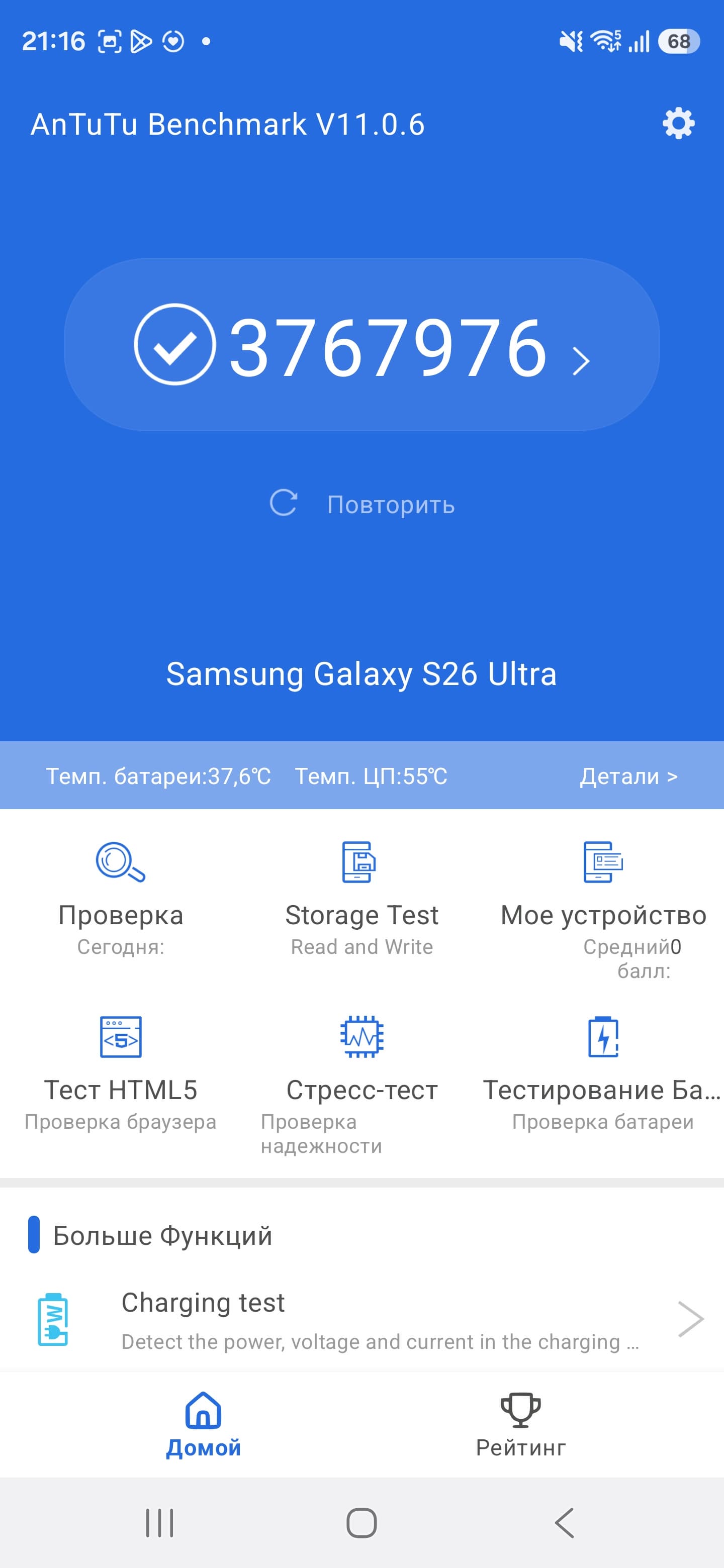 Смартфон Samsung Galaxy S26 Ultra работает на восьмиядерной SoC Qualcomm SM8850-AC Snapdragon 8 Elite Gen5 (специальная версия для устройств Galaxy с увеличенной процессорной частотой). Она производится по нормам 3-нанометрового техпроцесса. Это аппаратная платформа максимально высокого уровня — самая топовая и наиболее мощная флагманская мобильная SoC текущего поколения. Ее производительности достаточно и даже избыточно для выполнения абсолютно любых задач, включая видеосъемку с высокой частотой кадров и в 8K и самые требовательные игры.