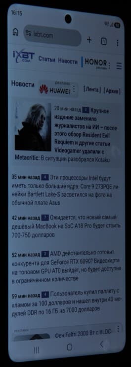 Подведем итоги. Экран имеет очень высокую максимальную яркость (до 1300 кд/м² на белом поле во весь экран) и обладает великолепными антибликовыми свойствами, поэтому устройством без проблем можно пользоваться вне помещения даже летним солнечным днем. В полной темноте яркость можно понизить до комфортного значения (вплоть до 1 кд/м²). Допустимо использовать режим с автоматической подстройкой яркости, работающий адекватно. К достоинствам экрана нужно отнести эффективное олеофобное покрытие, поддержку режима с высокой частотой обновления 120 Гц, а также близкий к sRGB цветовой охват и очень хороший цветовой баланс (при выборе правильного профиля) с возможностью корректного вывода изображений с цветовым охватом Display P3/DCI-P3. Заодно напомним про общие достоинства OLED-экранов: истинный черный цвет (если в экране ничего не отражается), заметно меньшее, чем у ЖК, падение яркости изображения при взгляде под углом. К недостаткам можно отнести модуляцию яркости экрана (с частотой 480 Гц), при желании выявляемую визуально на низкой яркости. У пользователей, особо чувствительных к мерцанию, из-за этого может возникать повышенная утомляемость. Тем не менее, в целом качество экрана очень высокое.