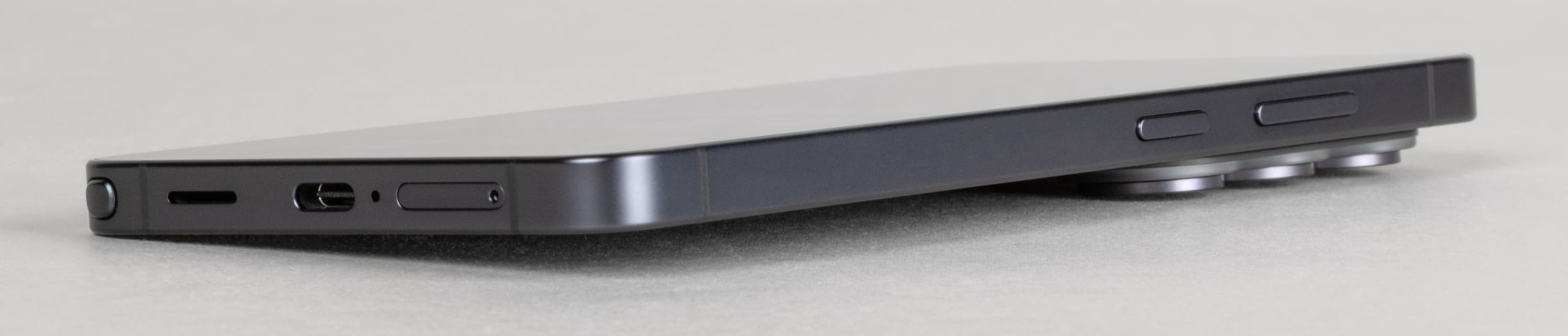 На торце снизу установлены динамик, разъем USB Type-C и микрофон с динамиком. В выдвижной лоток можно в зависимости от модификации установить одну или две карты Nano-SIM, для карты памяти microSD места не предусмотрено.
