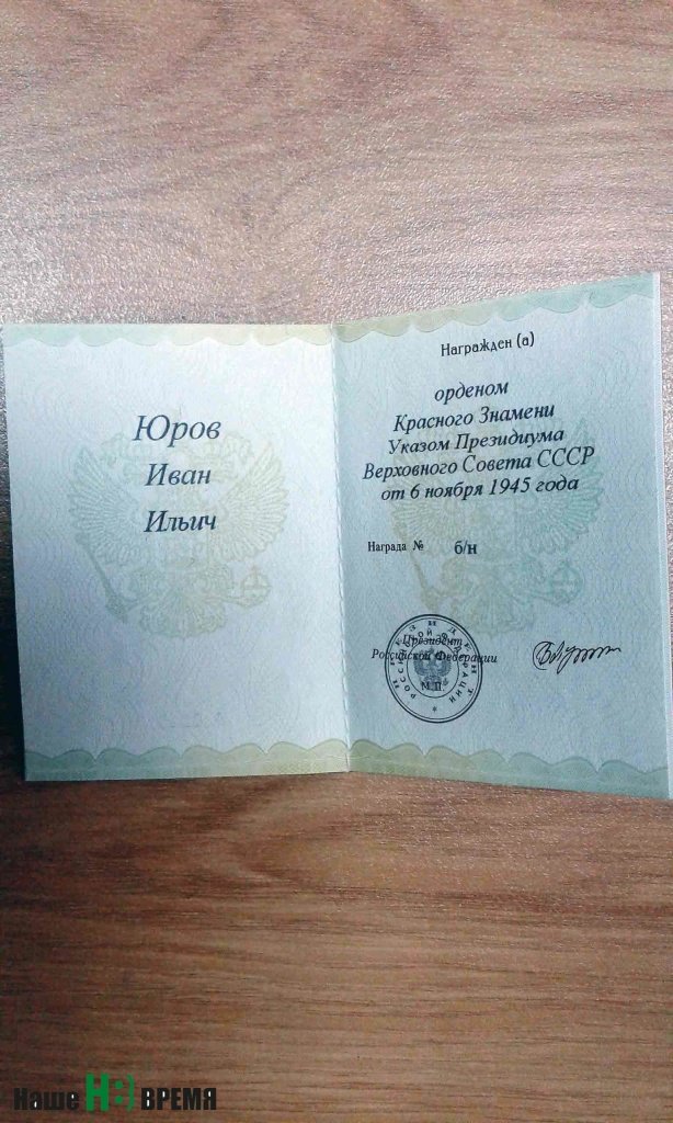 Так, исполняющий обязанности военкома области Валерий Лунин вручил удостоверение к ордену Красного Знамени, подписанное Владимиром Путиным, Юрию Юрову. Его отец красноармеец Иван Ильич Юров был удостоен этой награды еще осенью сорок пятого – соответствующий указ принимал Президиум Верховного совета СССР. Однако по какой-то причине фронтовику эту награду тогда не вручили.