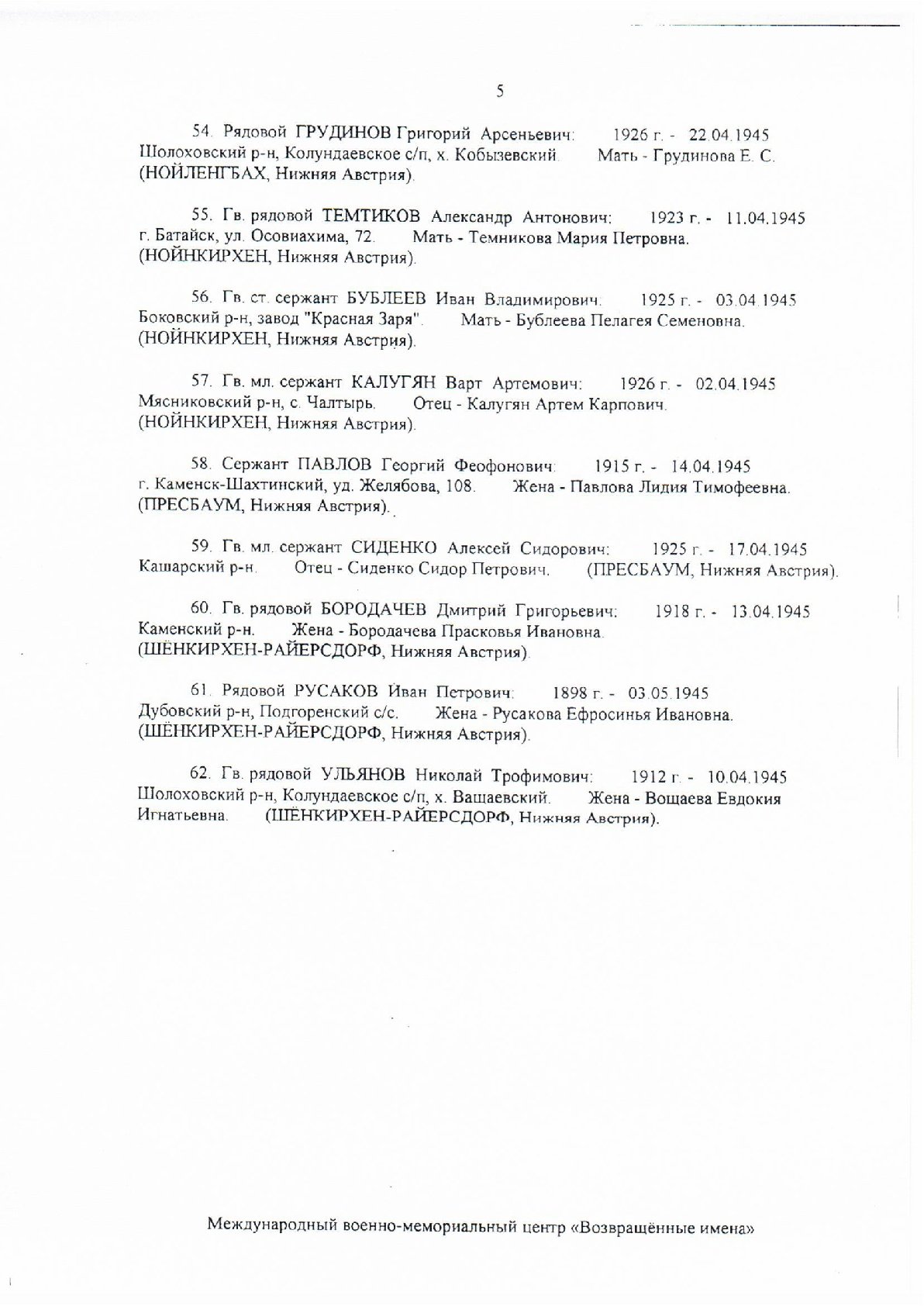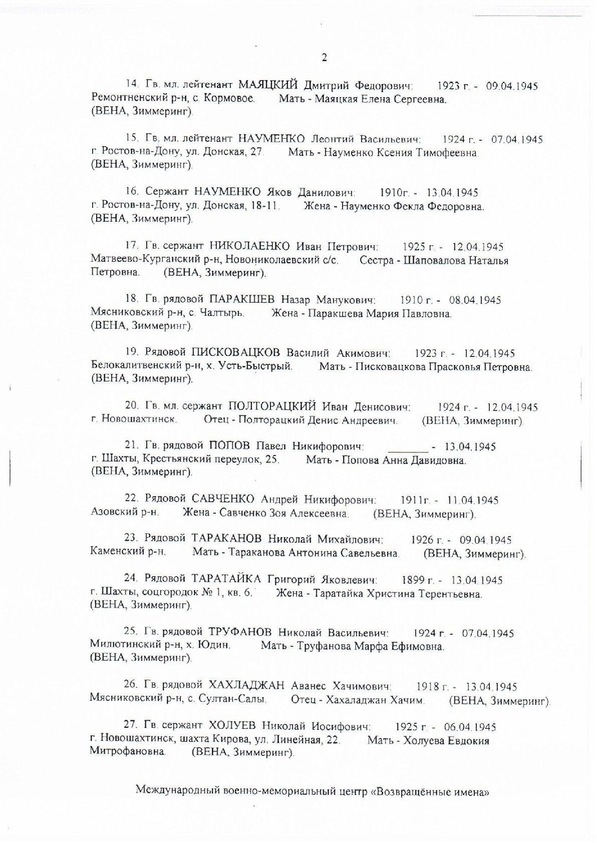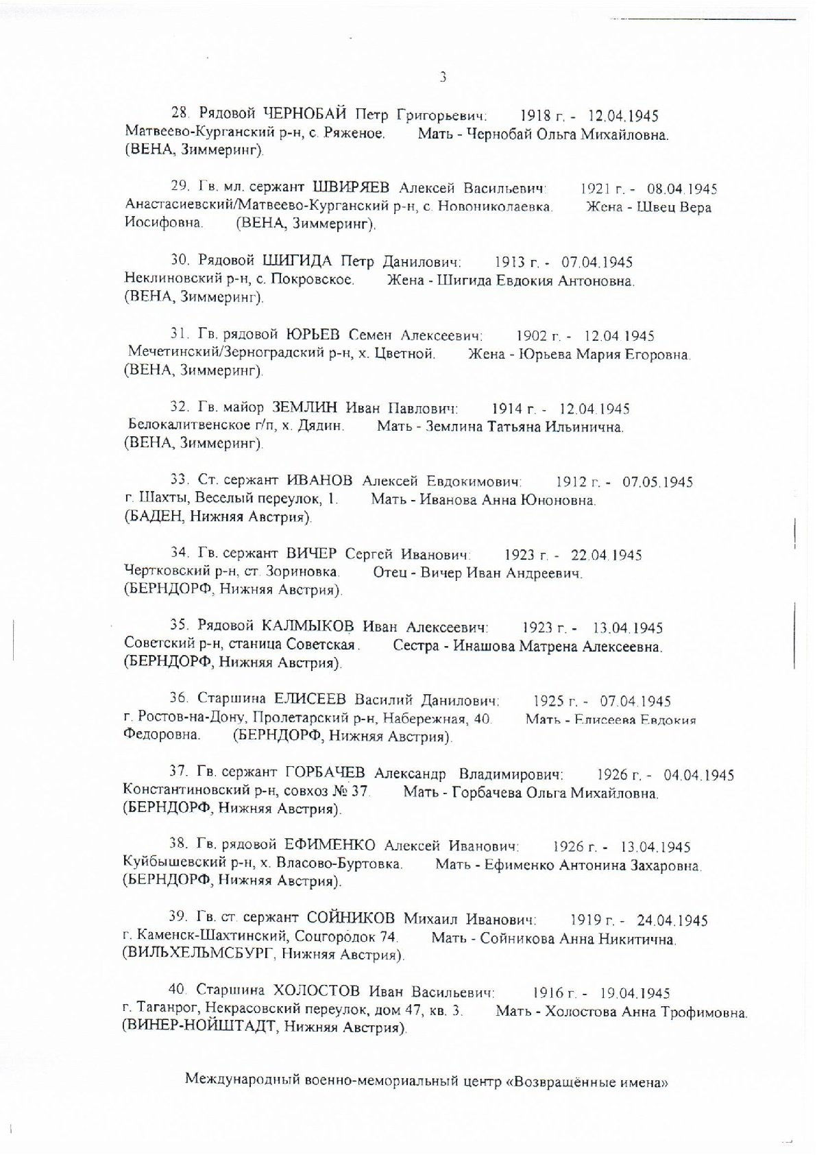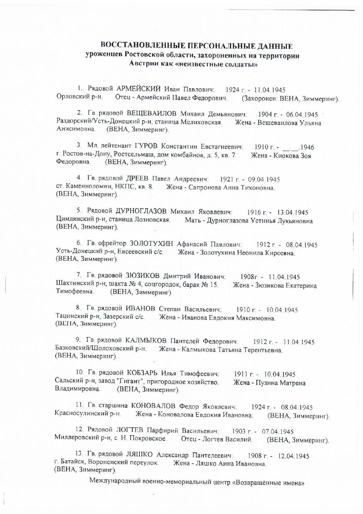 Международный военно-мемориальный центр «Возвращенные имена» продолжает розыск родственников советских воинов, не вернувшихся с фронтов Великой Отечественной войны.