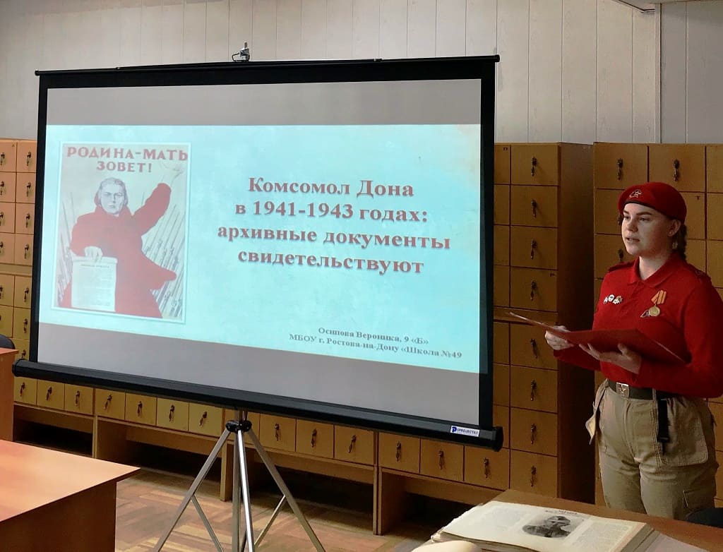 Она была посвящена 75-летию Победы. Участники конкурса школьных музеев «Мы помним» из ростовской школы №49, активисты виртуального музея этого учебного заведения, члены школьной научно-исследовательской ассоциации "Поиск», юнармейцы рассказали собравшимся о ходе работы над исследовательскими проектами, которая выполняется на основе документов, хранящихся в архивных фондах "Комсомол Дона в 1941-1943 гг.: архивные документы свидетельствуют" и "Подростки г. Ростова-на-Дону в составе Ростовского стрелкового полка народного ополчения".