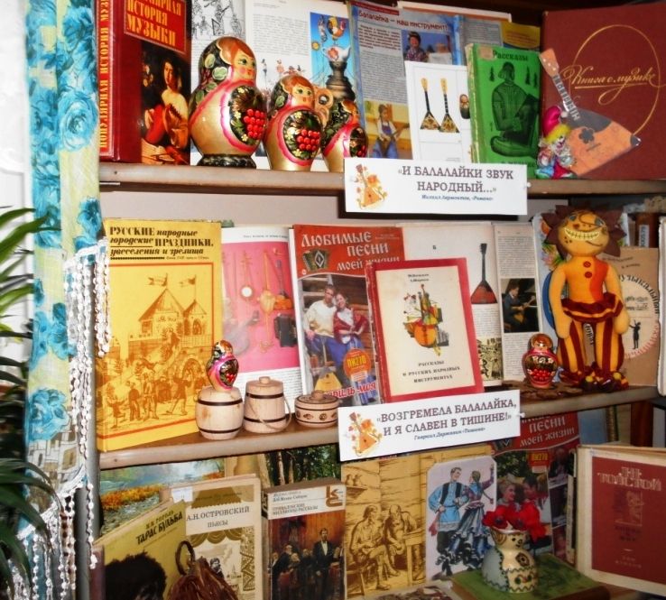 «Рассказы о русских народных инструментах» Ю. Васильева и А. Широкова, «Рассказы о музыке», «Энциклопедический словарь юного музыканта», «Краткий музыкальный словарь» Ю. Булучевского и В. Фомина, другие представленные на выставке издания рассказывают о самом молодом отечественном струнном инструменте, биография которого насчитывает чуть более трехсот лет. «В лесу выросло, из лесу вынесли, на руках плачет, а на полу скачет» – такую поговорку-загадку народ сложил о балалайке. Возможно именно за звонкость и шаловливость (от слова «балаболка») обрела свое название балалайка. Следует отметить, что многие балалайки, наподобие своей «прародительницы» – домры, имели овальный корпус, а некоторые вообще изготовлялись из тыквы – знаменитый русский композитор, скрипач, балалаечник и дирижер Иван Хандошкин играл на сделанной из тыквы балалайке, проклеенной внутри порошком битого хрусталя, что придавало звуку «особую чистоту и серебристость».