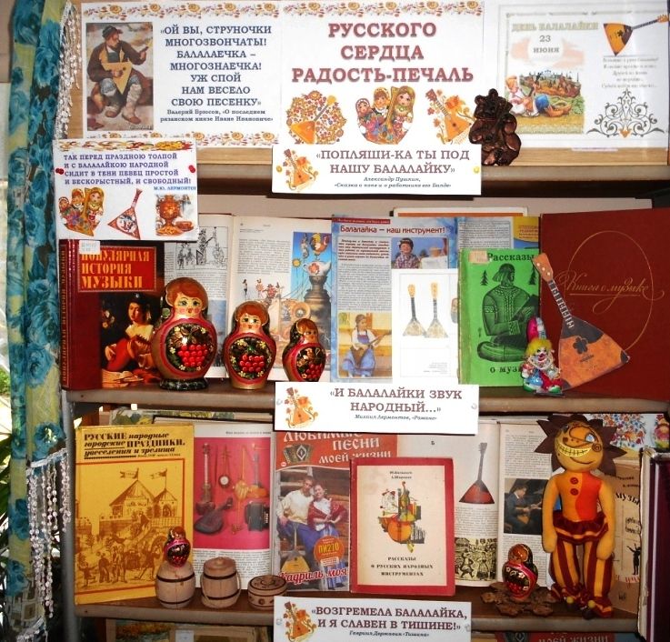 «Ой, вы, струночки – многозвончаты! Балалаечка – многознаечка! Уж спой нам весело свою песенку...» – эти наполненные искренней любовью к народному символу России строки стихотворения «О последнем рязанском князе Иване Ивановиче» Валерия Брюсова стали цитатой-лейтмотивом выставки-дифирамба «Русского сердца радость-печаль», организованной в читальном зале библиотеки-филиала №4 им. М.М. Коцюбинского ЦБС для взрослых Симферополя. Выставка организована в рамках Года культурного наследия народов России, и приурочена к празднованию Дню балалайки, ежегодно отмечаемому 23 июня.