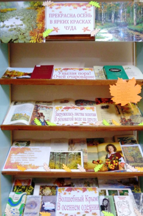 Осень – удивительное время года, вызывающее одновременно и радость, и печаль. Золотая пора, украшенная разноцветным нарядом, никого не оставляет равнодушным к этому неповторимому очарованию. «Прекрасна осень в ярких красках чуда» – под таким названием в библиотеке-филиале №4 им. М. М. Коцюбинского централизованной библиотечной системы для взрослых Симферополя начала работу выставка осеннего настроения.