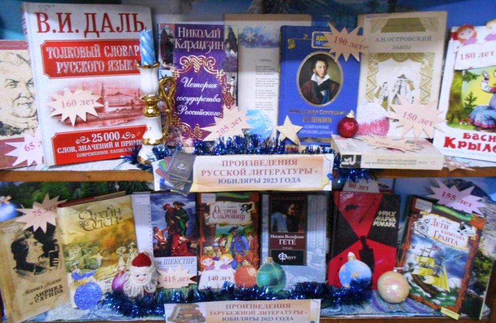 На юбилейной полке зарубежной литературы уютно разместились:  трагедия У. Шекспира «Король Лир», со времени издания которой в 1608 году прошло 415 лет, философская трагедия И.В. Гёте «Фауст», первая часть которой была впервые опубликована 215 лет назад (1808),  роман Дж. Остин «Гордость и предубеждение», который в начавшемся году отпразднует свое 210-летие со времени опубликования в 1813 году,  аллегорическая повесть-сказка А. Сент-Экзюпери «Маленький принц», написанная и впервые опубликованная 80 лет назад, «Лирика и сатира»  Генриха Гейне, изданная в Москве в 1948 году и др.
