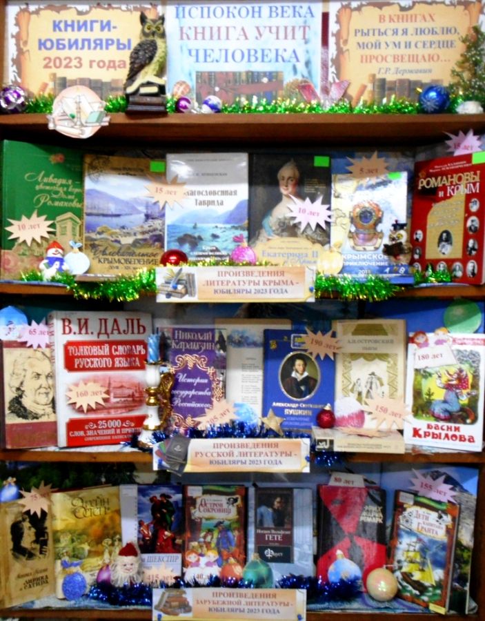«В книгах рыться я люблю, свой ум и сердце просвещаю», – эти замечательные слова выдающегося русского поэта, государственного деятеля Гавриила Романовича Державина стали цитатой организованной в симферопольской библиотеке-филиале №4 им. М. М. Коцюбинского выставки-юбилея «Испокон века книга учит человека.  Книги – юбиляры 2023 года».
