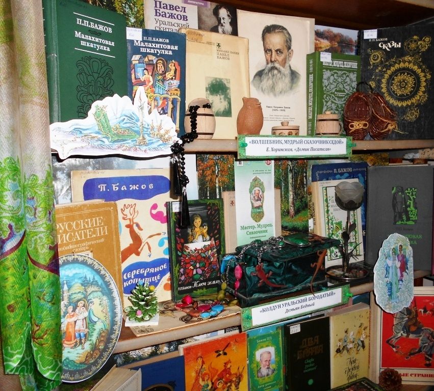 Выставка-инсталляция привлекает внимание маленьких и взрослых читателей малахитовой шкатулкой с украшениями из малахита и крымских самоцветов, фигуркой «Каменного цветка мастера Данилы», приглашает взять в руки представленные красочные издания Павла Бажова и самозабвенно окунуться в самобытный и уникальный мир его сказов, написанных языком добра и красоты.