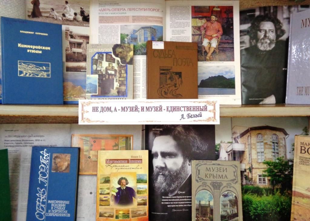 Издания, представленные в разделах «Мой дом раскрыт навстречу всех дорог» (М. Волошин) и «Не дом, а – музей; и музей – единственный» (А. Белый) знакомят с историей создания легендарного дома, ставшего «художественной колонией для поэтов, ученых и художников». «Судьба поэта» Игоря Куприянова, «Серебряная память Коктебеля» Вячеслава Ложко, «Киммерийские этюды» Владимира Купченко, путеводители «Музеи Крыма», «Дом-музей М.А. Волошина» расскажут о начале строительства в мае 1903 года Максимилианом Волошиным на пустынном участке коктебельской земли, между двух ручьёв, на самом берегу моря собственного дома. К августу строительство «первой очереди» будущего Дома поэта было завершено. Дом предстал двухэтажным, с лестницей, террасами и одноэтажной пристройкой. Знаменитая мастерская, напоминающая романский храм, была достроена позднее, и только к 1913 году строение приняло окончательный вид, став центром местного пейзажа, без которого невозможно представить современный Коктебель.