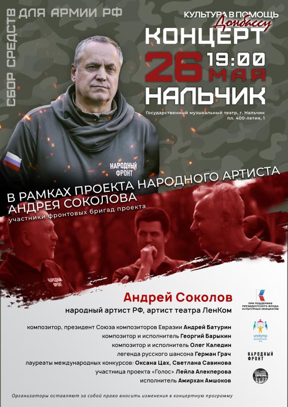 26 мая 2025 года в Нальчике при поддержке Президентского фонда культурных инициатив состоится благотворительный концерт «Культура в помощь Донбассу». Талантливые артисты, поэты и композиторы выступят перед жителями и гостями города с целью оказания поддержки участникам специальной военной операции и их семьям. Проект инициировали народный артист России Андрей Соколов и президент Союза композиторов Евразии Андрей Батурин.