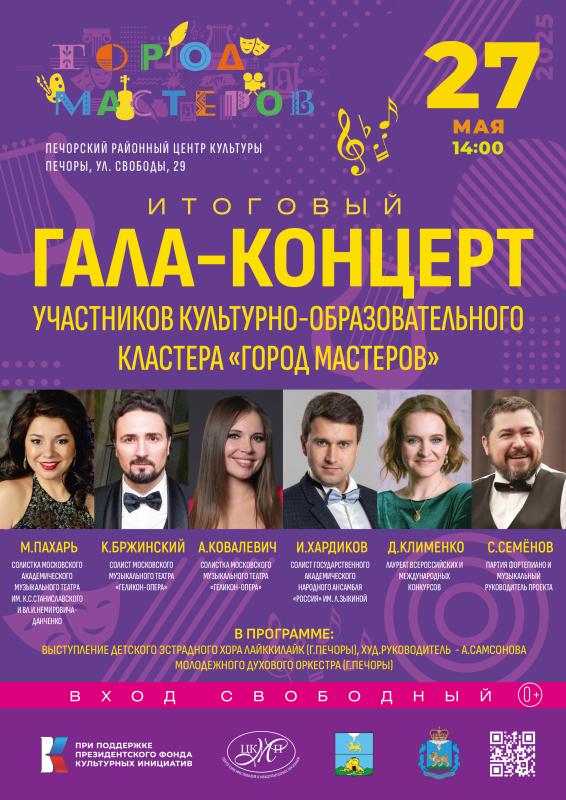 27 мая 2025 г. в Печорском районном центре культуры пройдет итоговый гала-концерт участников культурно-образовательного кластера «Город мастеров», поддержанного Президентским фондом культурных инициатив.