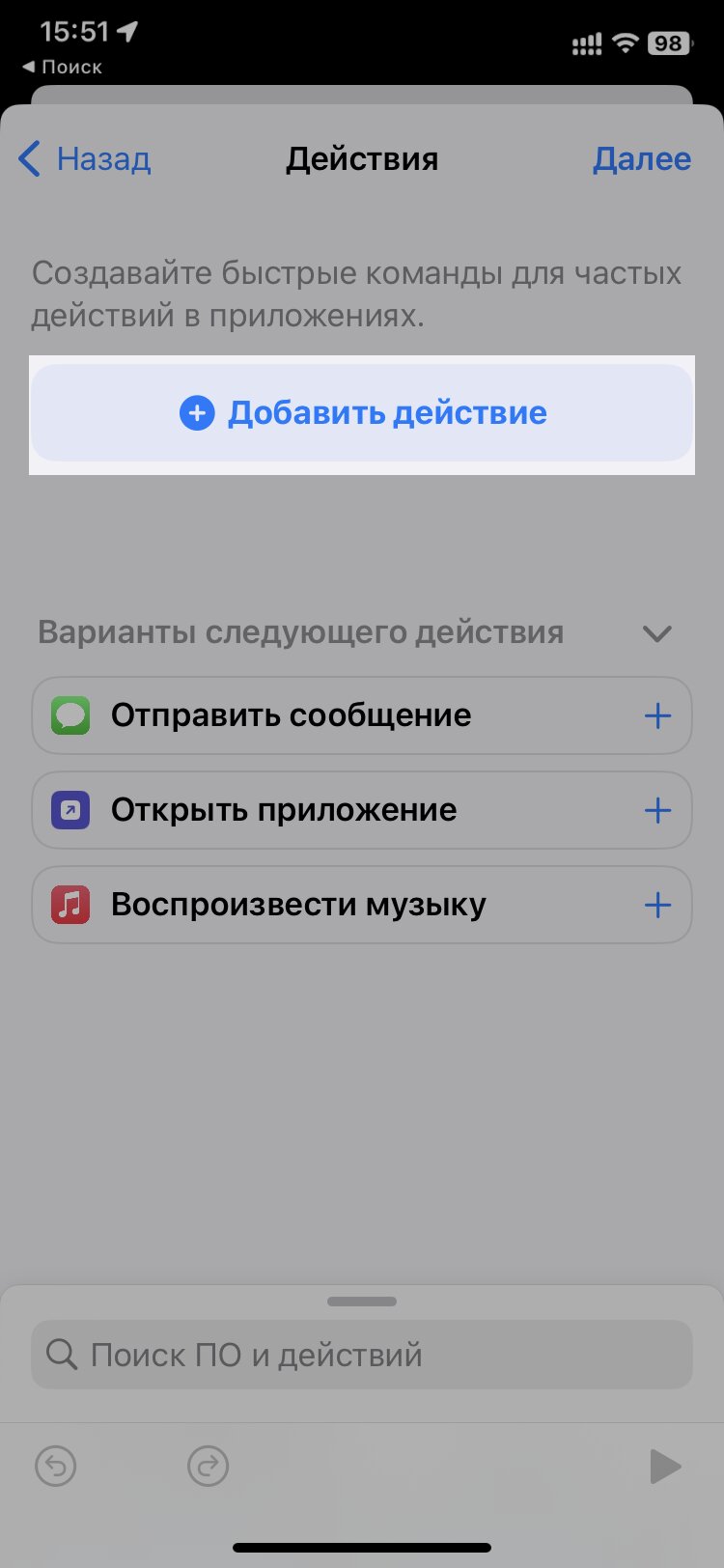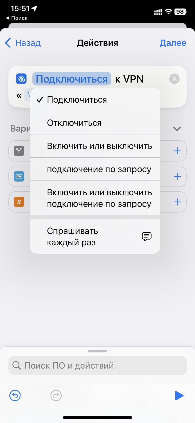- В текстовом поле вверху по умолчанию будет слово-команда «Подключиться» — при желании действие можно изменить, в том числе на «Отключиться». В конце будет параметр VPN, по клику на который можно выбрать приложение с настроенным VPN-протоколом. Когда зададите эти настройки, нажмите на «Далее в правом верхнем углу».